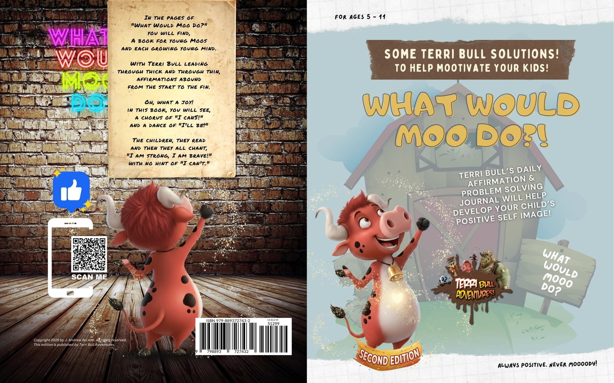 “What Would Moo Do?” goes beyond mere words by presenting over 70 engaging challenges to stimulate critical thinking and problem-solving abilities in children aged 5-11. Our Second Edition, features over 75 new full color illustrations featuring Terri and the gang! Get yours today and help your child develop positivity and problem solving skills surrounding issues they deal with on the daily! Now available on Amazon!