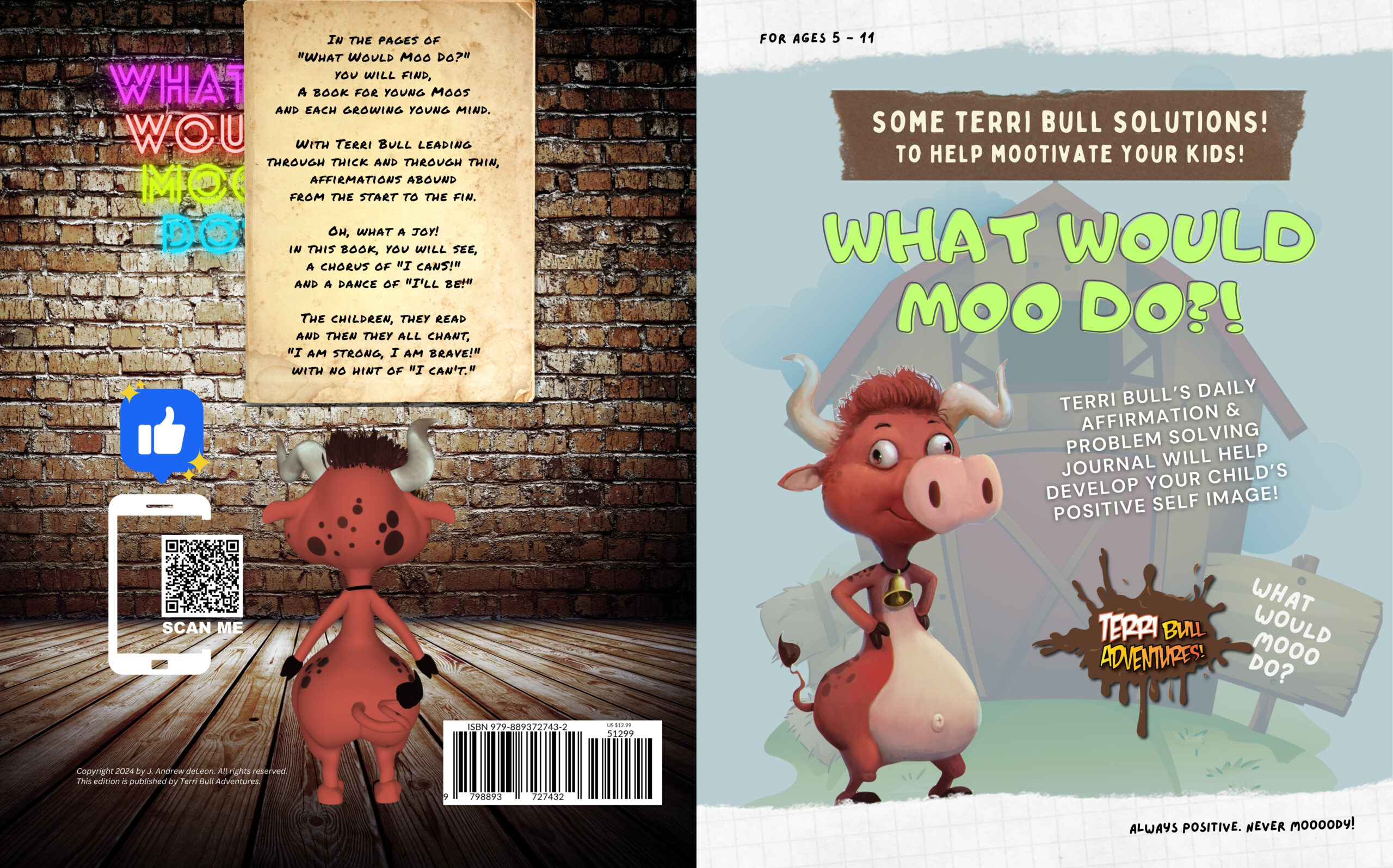 Terri Bull’s Daily Affirmation and Problem Solving Journal was created to start a conversation between parents/ teachers/ counselors and their children/students/patients (little moos) regarding the best way to resolve conflicts and overcome challenges in a healthy and positive, “Terri Bull” way by asking the question, “What Would Moo Do?“